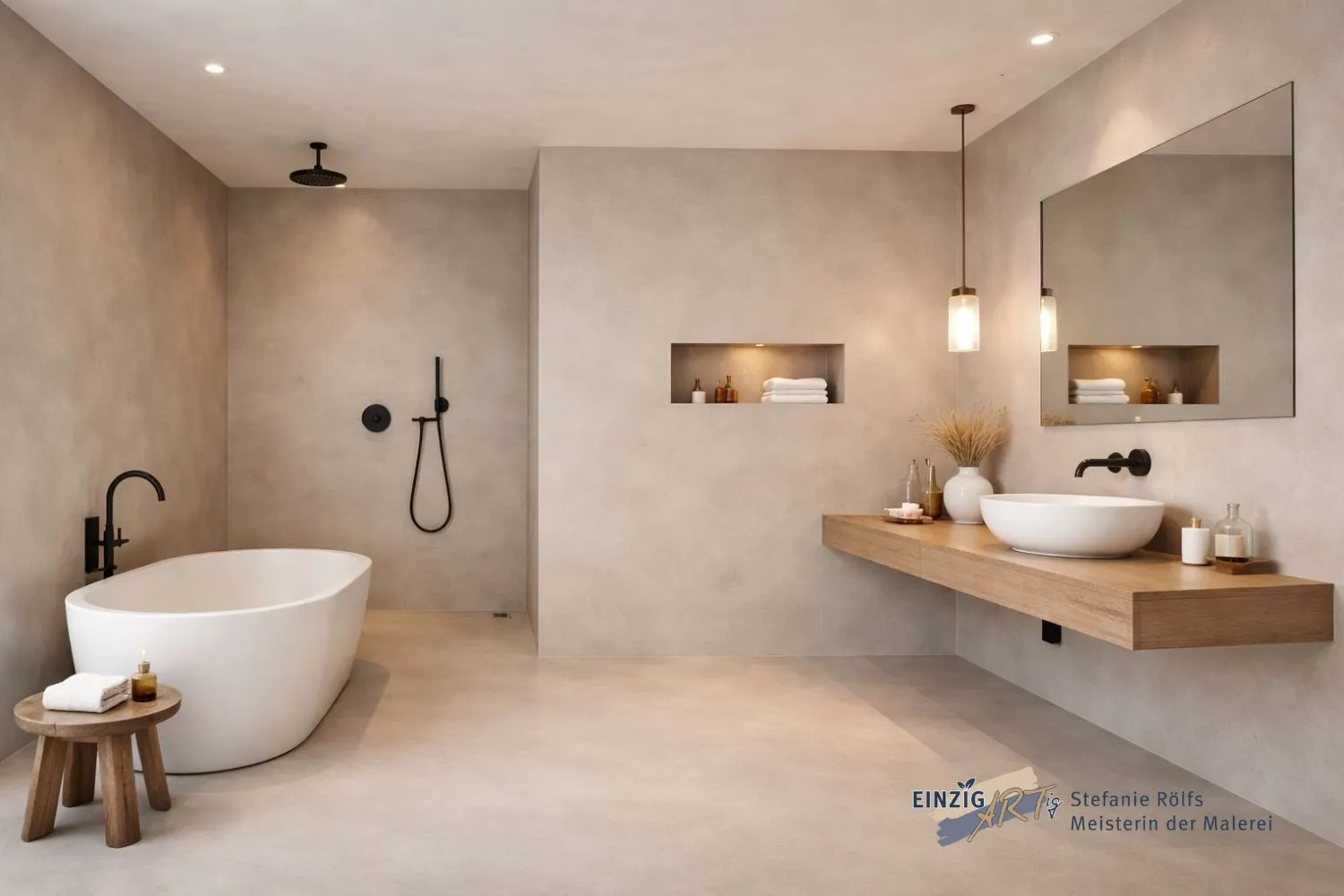 Praxisgedanke: Ein gelungenes Bad ohne Fliesen muss nicht überall mit demselben Material arbeiten. Entscheidend ist, dass es am Ende wie aus einem Guss wirkt – nicht, dass jede Zone identisch aufgebaut ist.